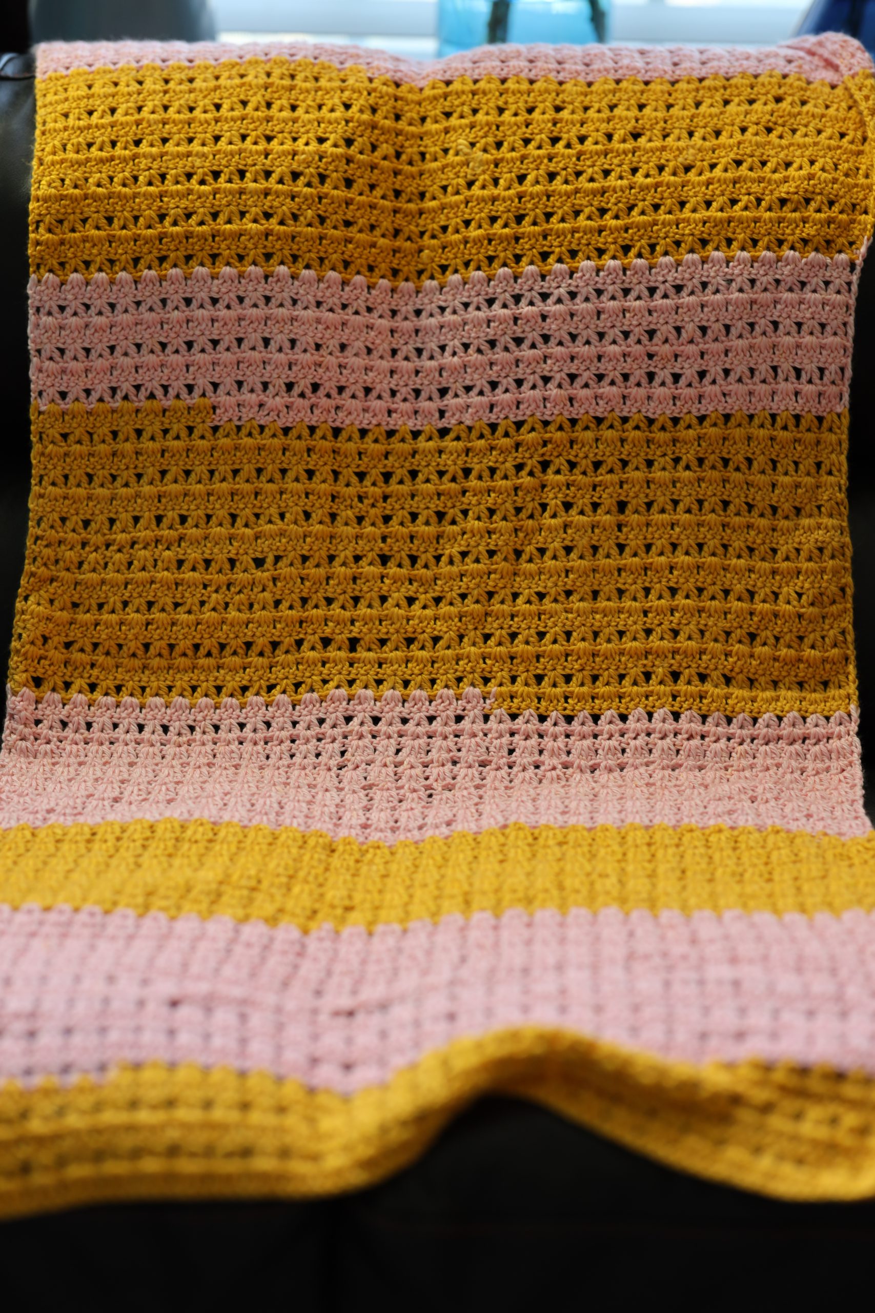 To preserve its delicate beauty and softness, gently hand wash the blanket in cold water using a mild detergent. Avoid harsh agitation or twisting to maintain the integrity of the crochet stitches and the vibrant colors of the pink and golden yarns. Lay flat to air dry, ensuring it retains its shape and remains a comforting companion for your baby’s peaceful moments.