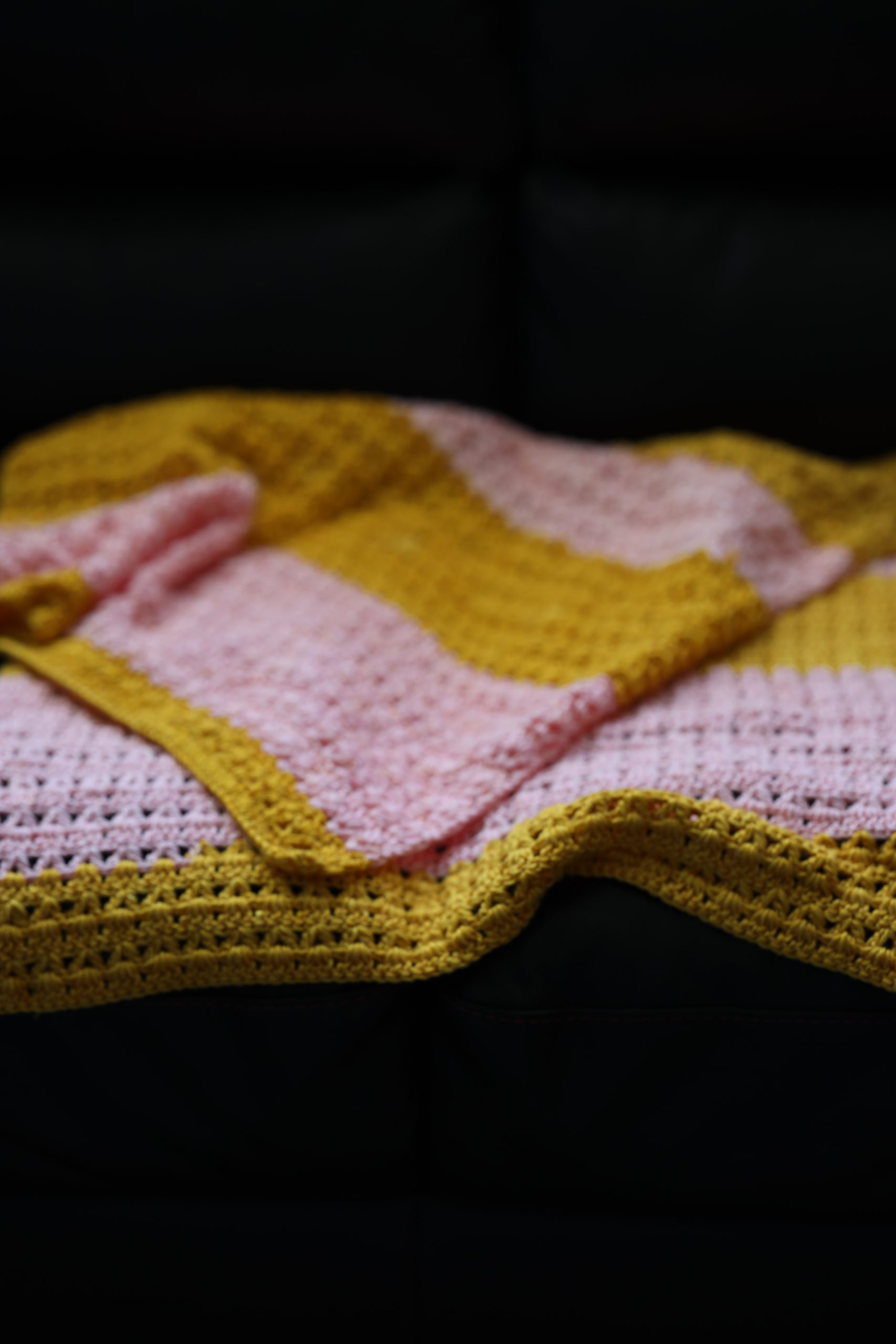 The charming baby blanket is handcrafted with pink and golden yarn, featuring intricate crochet work that combines warmth with delicate beauty, perfect for keeping your little one cozy and stylish.