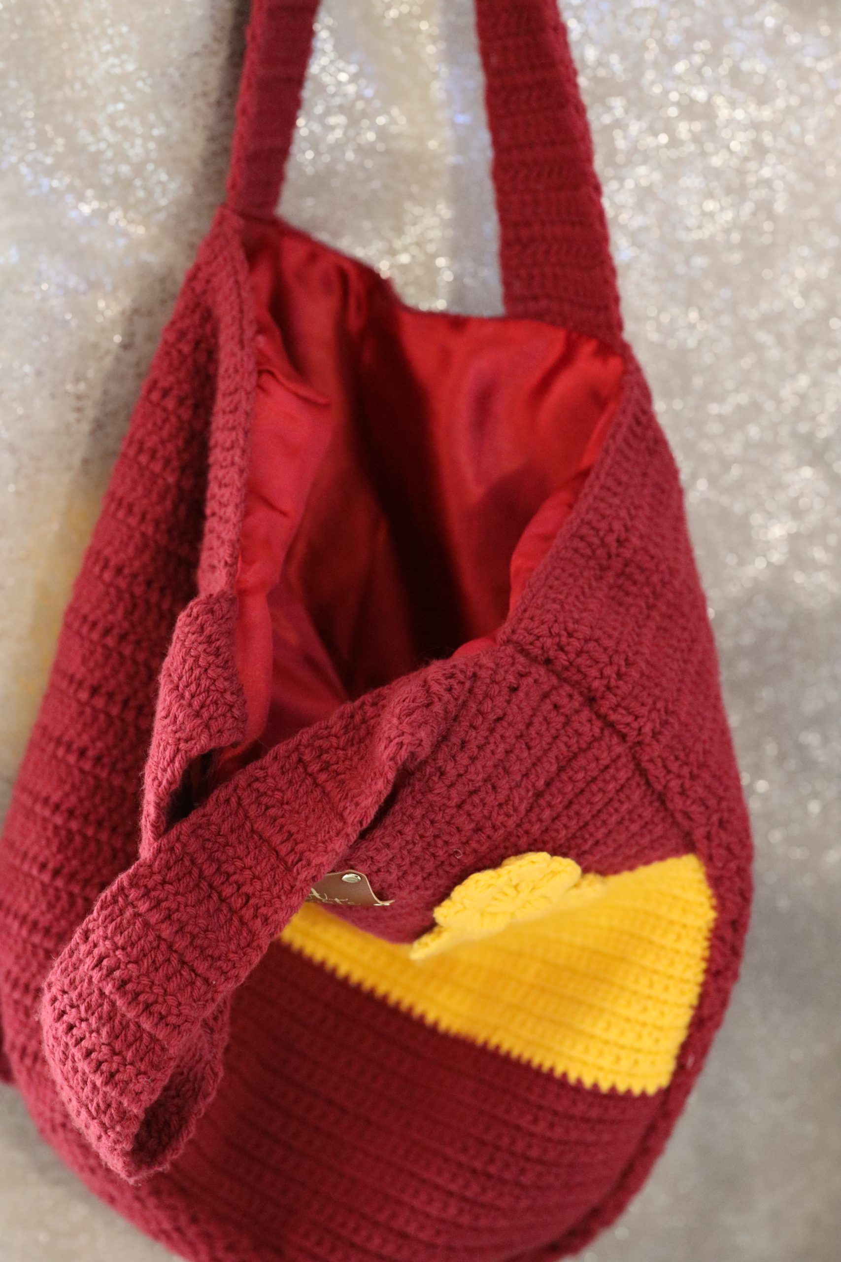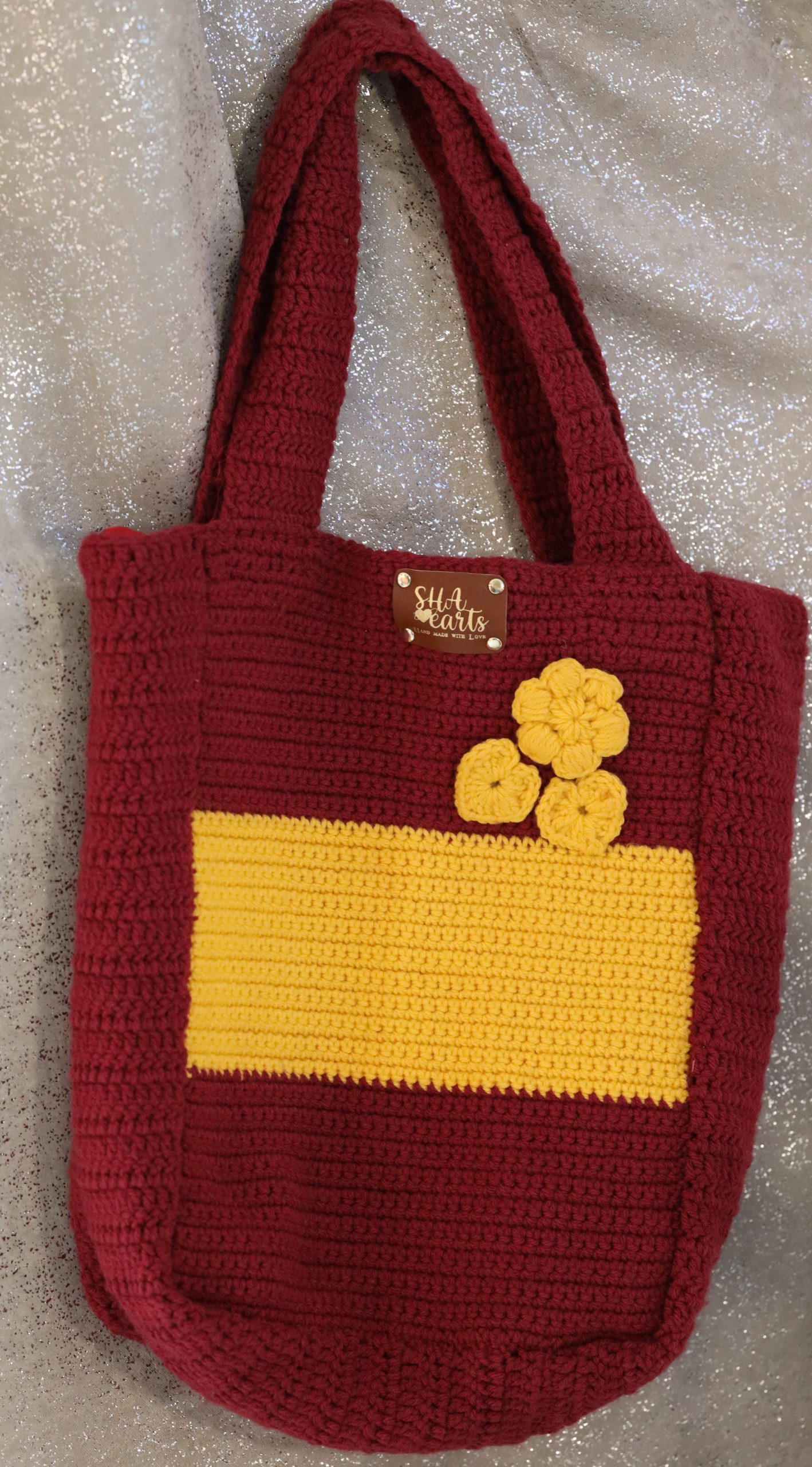 The Sun-Kissed Stitches Bag features a striking maroon base with a vibrant yellow stripe running through the center. Adorning this beautiful stripe are three hand-crocheted yellow flowers, adding a touch of charm and elegance. Perfect for adding a pop of color to any outfit, this bag is a blend of boldness and delicate craftsmanship, making it a unique accessory for any occasion.